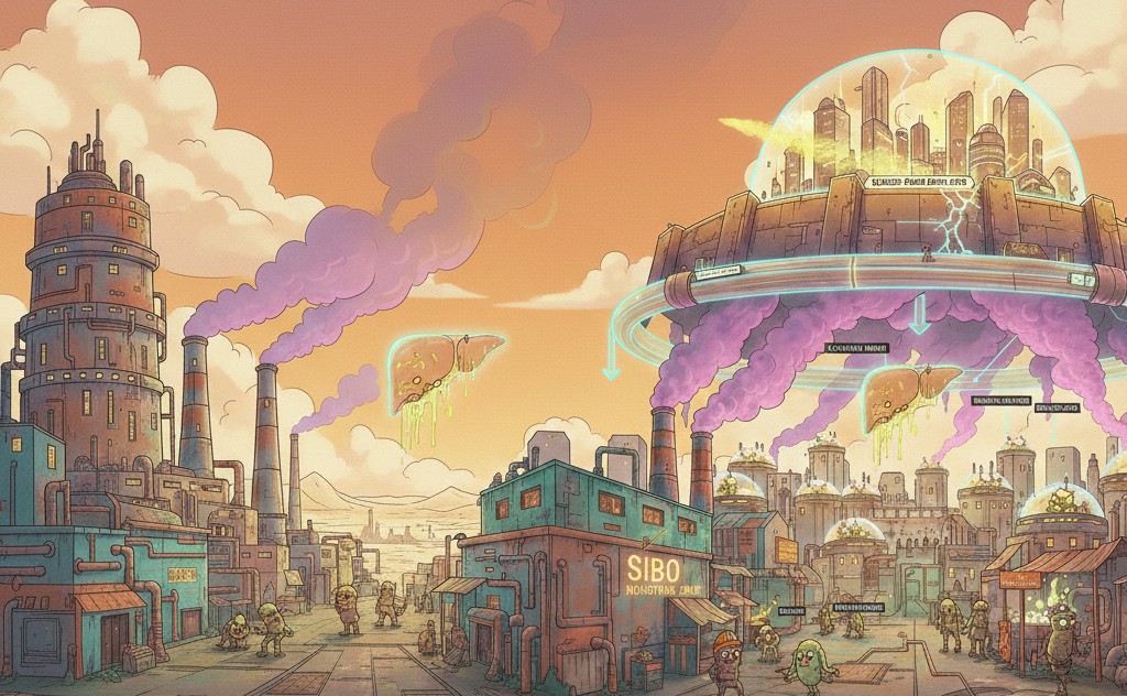 La métaphore urbaine : Imaginez que la Zone Résidentielle (l’intestin grêle), qui doit rester calme et propre, est soudainement envahie par des squatteurs (les bactéries du côlon). Ces squatteurs installent des cuisines de rue et des ateliers de fortune un peu partout. Ils consomment les livraisons de nourriture avant qu’elles n’arrivent aux citoyens et rejettent leurs déchets (gaz, acides) directement sur les trottoirs.C’est cette activité sauvage qui crée les ballonnements et qui génère la première couche de fumée toxique du modèle MCL.