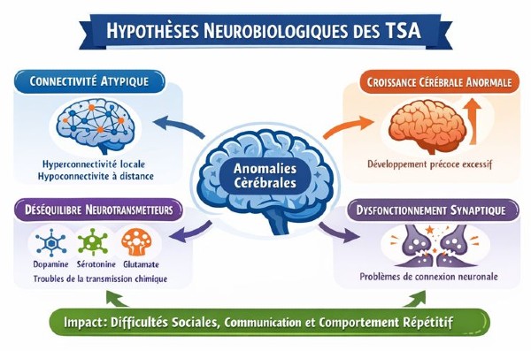 Certaines théories suggèrent que le TSA résulte d’un développement atypique du cerveau très tôt, affectant la socialisation, la communication et le comportement répétitif. Exemple : théorie de la « connectivité altérée » et théorie du « déficit de la cognition sociale », qui essaient de relier les anomalies cérébrales aux symptômes cliniques.