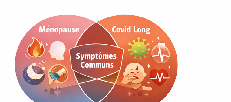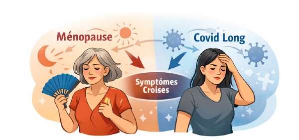 La transition hormonale (périménopause → ménopause) et un syndrome post-infectieux (dont le Covid long) peuvent produire des symptômes très proches : sommeil instable, fluctuations d’énergie, douleurs, anxiété interne, « brain fog », intolérances au chaud, palpitations…